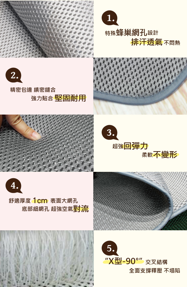 - 蜂巢型仿生結構,六面循環透氣,不黏膩